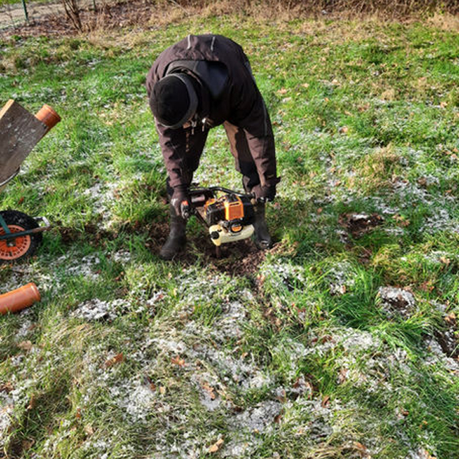We hebben in dit project een rioolbuis gebruikt van 110mm en een boor van 100mm om voor te boren en na te boren. We zijn 1 meter diep gegaan. Na wat tests heb ik gemerkt dat het niet nodig is om zijlings gaten te boren in de rioolbuis. Het water stijgt vanzelf in de buis.